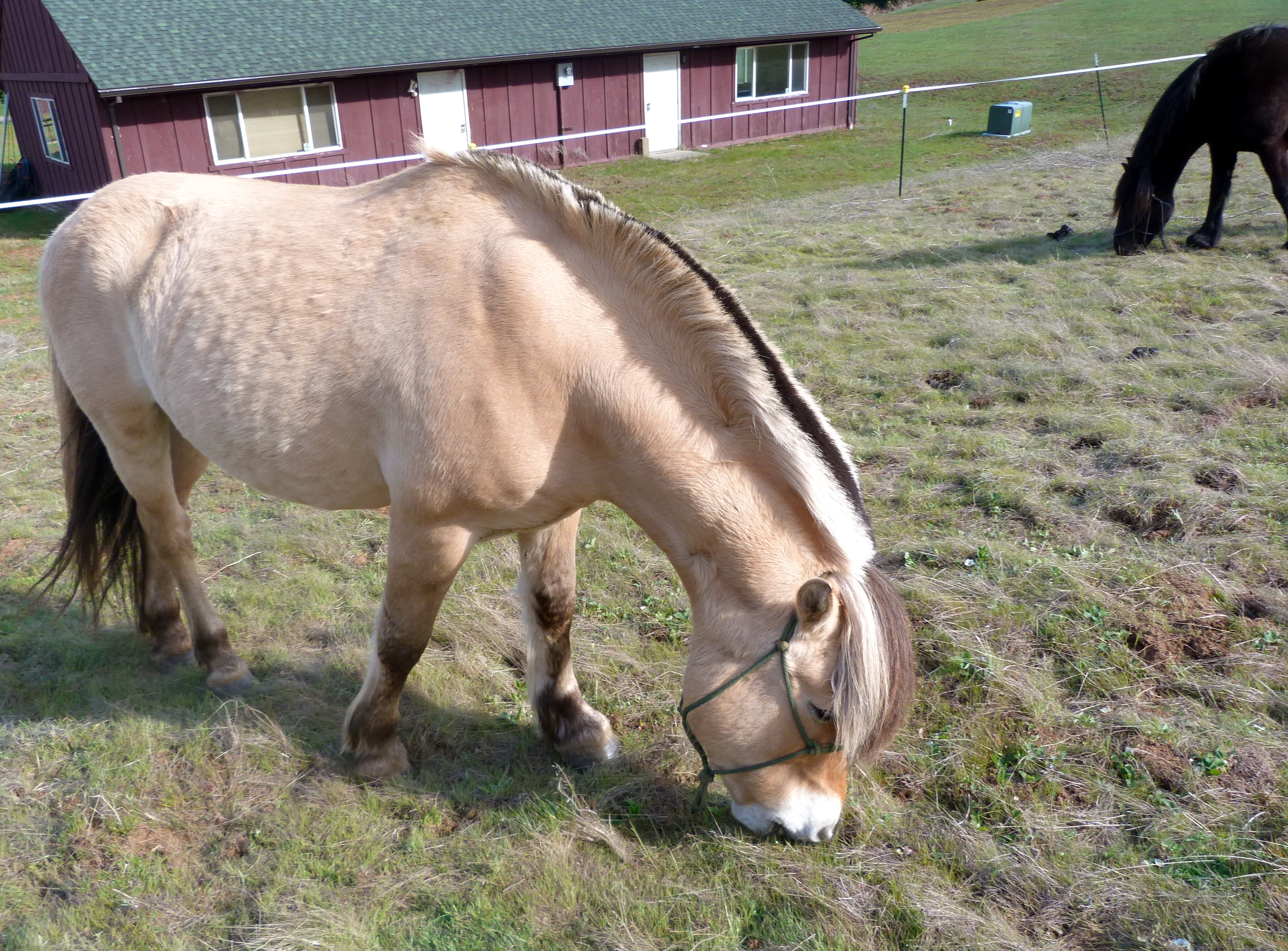 Bess and Duchess are Dales ponies, full sisters. Though Bess is older, Duchess is taller and more confident. Bess shied at every approach, and only Gary was able to get hold of her at first. Konall is a lover boy, ready to be petted and made over. Duchess, too, loves attention. She’s sweeter to us than to the others; she will gratuitously take a nip at her sister or Konall. Drader is calm and comfortable being petted or ridden. I make it a point to spend lots of time in the pasture, weeding the horse-toxic lupine and shoveling poop, bringing the occasional carrot, using the curry comb, and always generous with attention. The ponies are curious and every day more eager to approach me, even Bess, who only flinches now when I grab her halter.